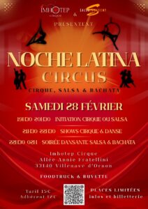 Installe-toi confortablement et laisse-toi émerveiller par nos artistes ! Nous vous proposons une alternance de show cirque, salsa et bachata.1 h de spectacle 100 % bordelais, pour découvrir les talents qui se cachent parmi nous…
